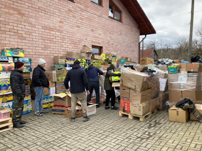 They are being transported to Pierwszotrawiensk (Zytomir region). This there is an intermediate station. We unpack the things here. We check what we have. Then we go to Zytomyr and to Kiev. Today we also delivered aid to Kharkiv. (So first of all we give aid to war zones. In this the volunteers help us. Here 15 people.