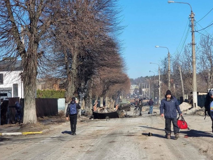 Irpian, in which intense fighting lasted, has been almost completely destroyed. No water, electricity, heating. After the bridge was blown up, no one could move by car, so people left their cars and walked together with children, animals, suitcases, strollers. Despite the fact that bombs are also falling on Kiev, civilians have no choice but to seek temporary shelter right there. The road to the west is cut off. (https://www.facebook.com/zbieramto/)