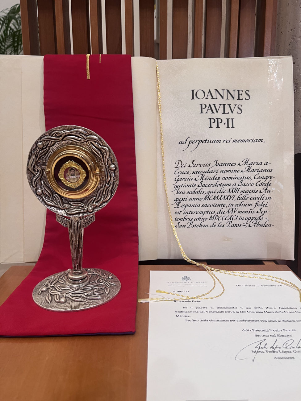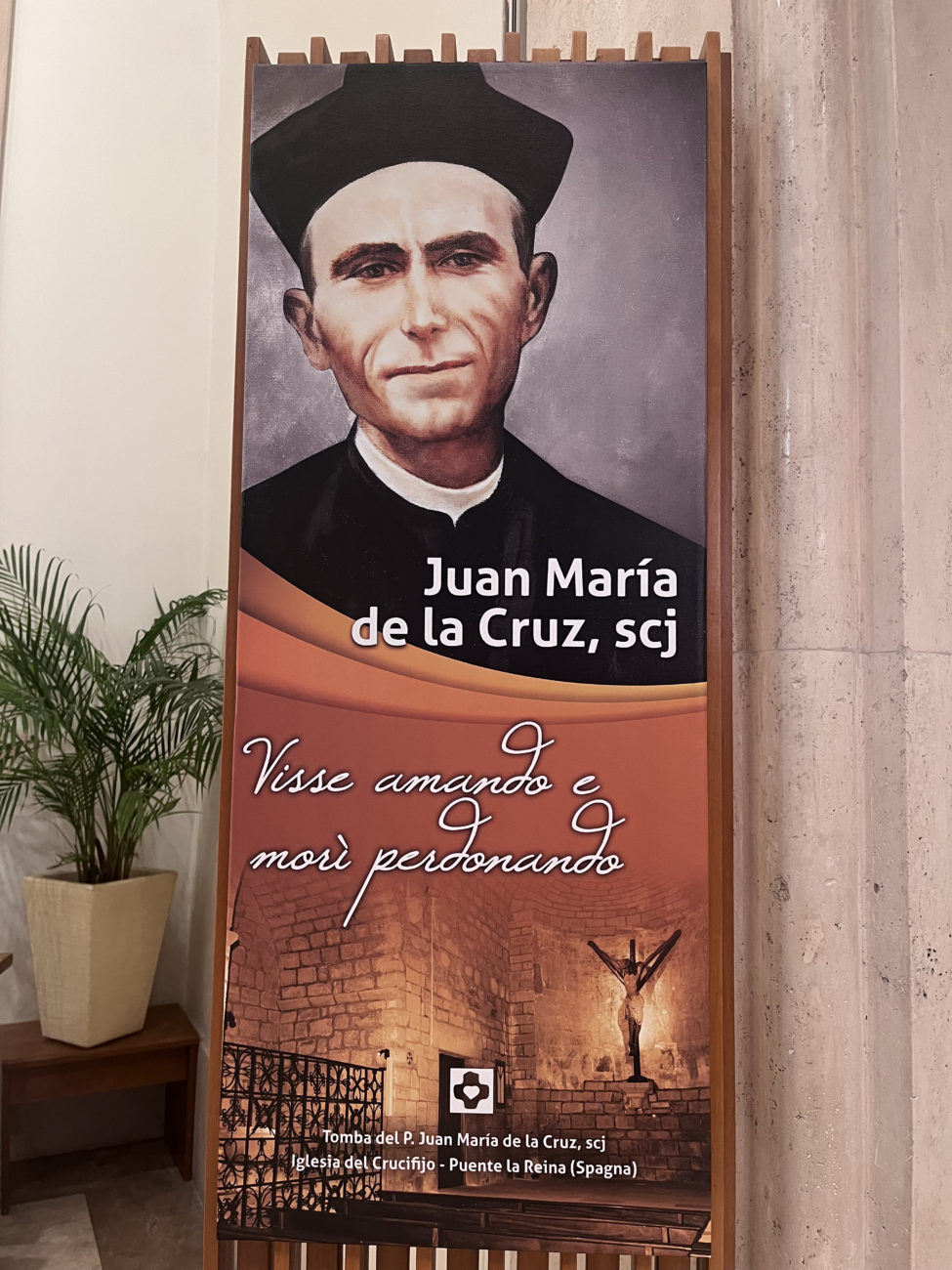 Nacido Mariano García Méndez, el Beato Juan María de la Cruz, SCJ, nació en San Esteban de los Patos (Ávila), España, el 25 de septiembre de 1891. Fue ordenado sacerdote el 18 de marzo de 1916. Movido por el deseo de vivir la vida religiosa, ingresó al Noviciado de los Sacerdotes del Sagrado Corazón y realizó su primera profesión el 31 de octubre de 1926 en Novelda (Alicante). Durante la persecución religiosa en España, fue posteriormente encarcelado y finalmente asesinado en la noche del 23 de agosto de 1936, a los pies de un olivo en la finca “El Sario” (Silla, Valencia).